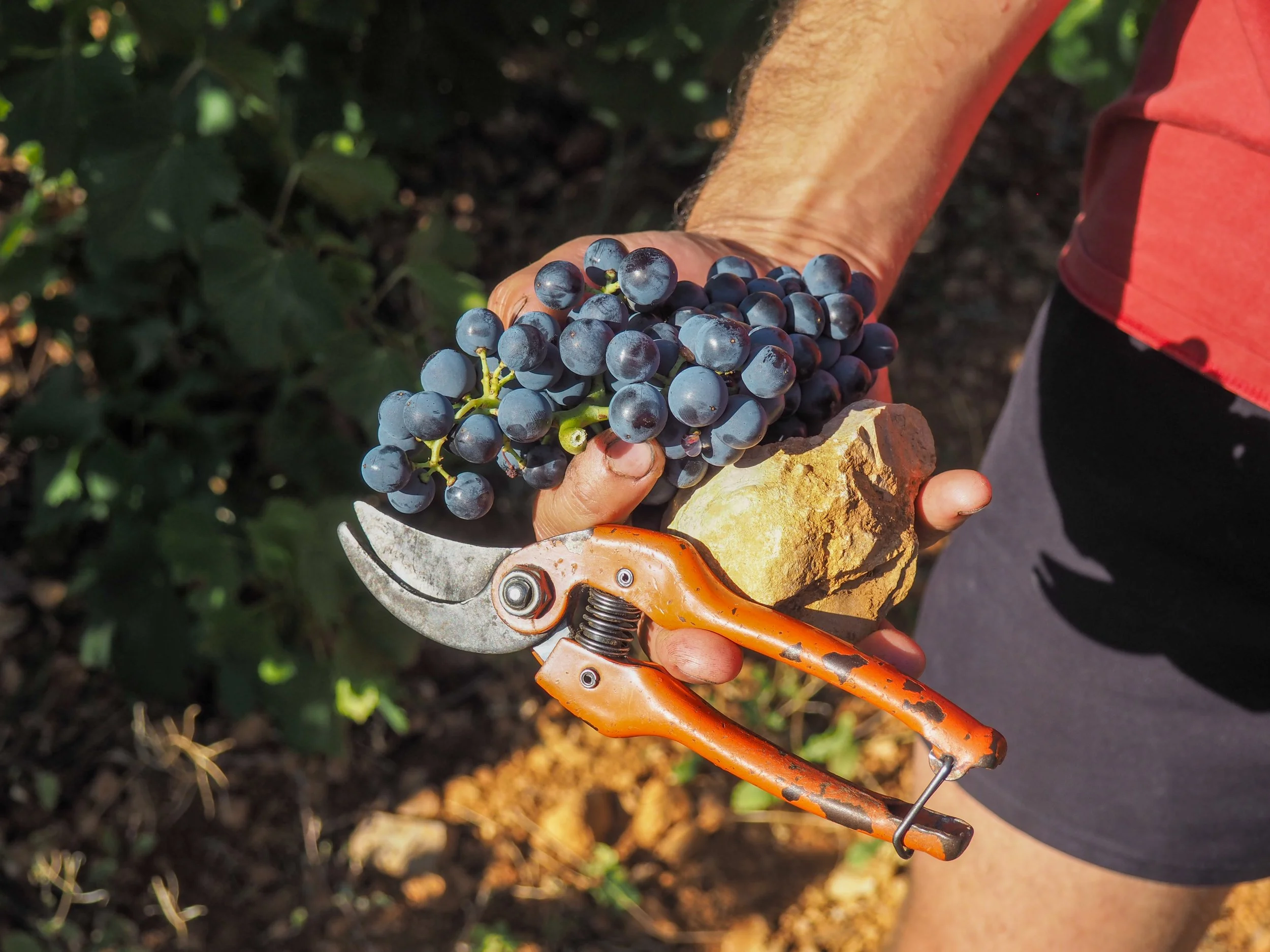 Les vignes évoluent sur des sols de cailloux et de coteaux argilo-calcaires, riches en pépites minérales : galets roulés du villafranchien, conglomérats calcaires, et graves issues du jurassique. Chaque parcelle est conduite en agriculture biologique, avec un soin particulier porté au respect du vivant : travail superficiel des sols, tonte, et parfois même la pioche pour un geste plus artisanal.